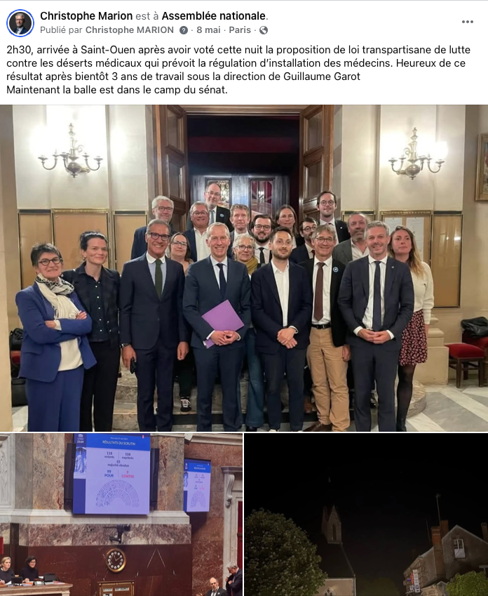 En séance plénière, j'ai défendu cette proposition de loi qui comprend 15 articles. Comme indiqué dans le communiqué de presse ci-joint, 11 de ces articles ont été repris dans la proposition de loi de Frédéric Valletoux, qui a été votée à l'Assemblée nationale il y a quelques jours. C'est une grande victoire qui démontre l'importance de travailler ensemble, au-delà des divergences politiques. Bien que la régulation de l'installation des médecins ait été rejetée, nous avons remporté une victoire culturelle : le rapporteur Frédéric Valletoux a clairement indiqué qu'il n'était pas opposé à la régulation !